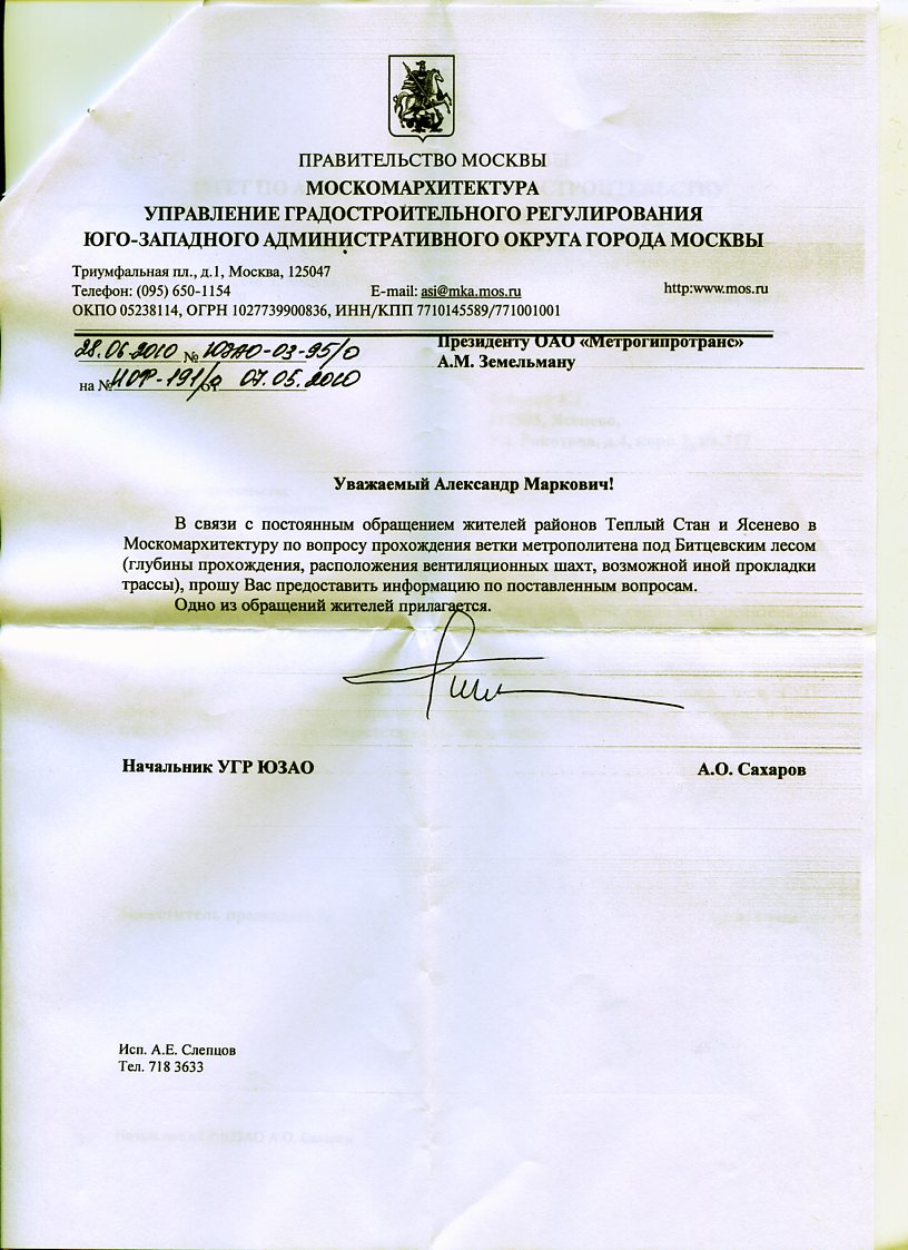 Начальник УГР ЮЗАО не имеет информации по вопросу прохождения ветки метрополитена под Битцевским лесом